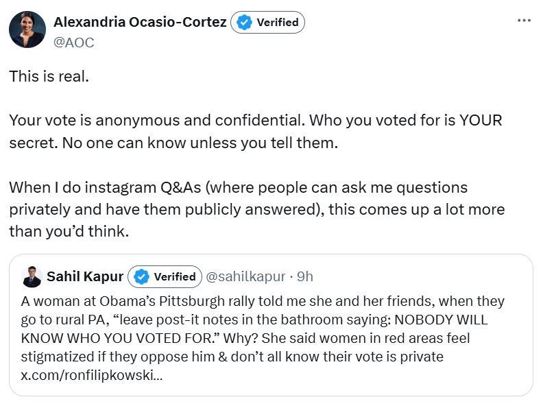 And then there’s Alexandria Ocasio-Cortez, who chimed in to remind people that, yes, your vote is private.