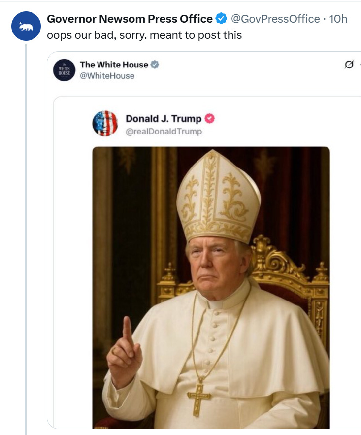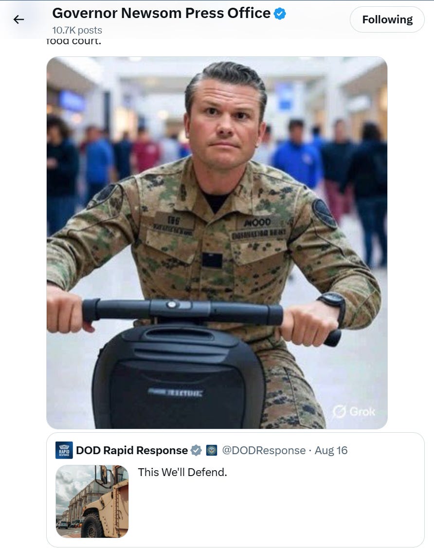Here’s a fun one where Newsom responded to a Defense Department post showing Washington, DC being occupied by federalized troops.