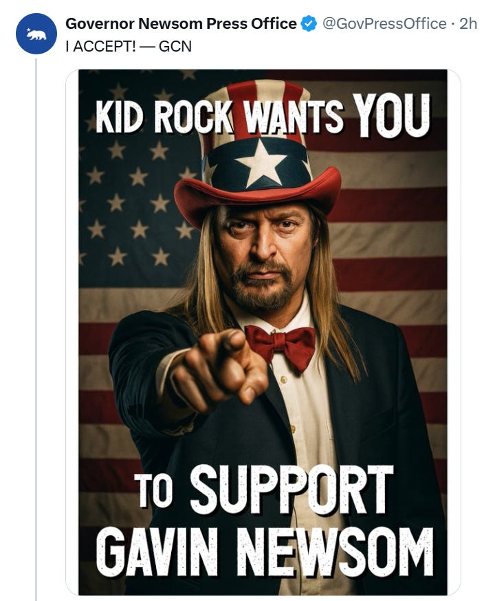 On social media, Newsom’s press team has unleashed a flurry of stylized posts on X, using full uppercase, over-the-top punctuation, and jabs aimed at Trump’s signature rhetoric. One post declared: