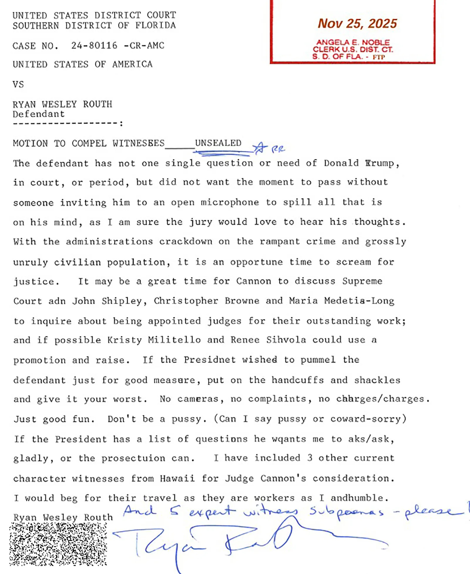 The motion includes an “open invitation” for Trump to “punch him in the face, as many times” as he wants. Routh even taunted the President by saying, “Don’t be a p****. (Can I say p**** or coward—sorry).”