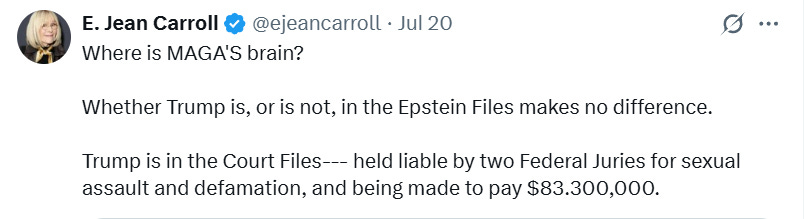 First up: “Where is MAGA's brain? Whether Trump is, or is not, in the Epstein Files makes no difference. Trump is in the Court Files--- held liable by two Federal Juries for sexual assault and defamation, and being made to pay $83.300,000."