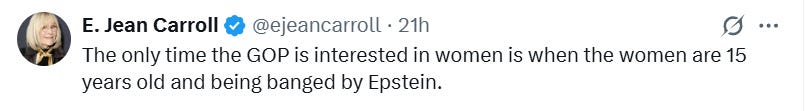 E. Jean Carroll takes Trumpsters to the woodshed: Epstein hypocrisy exposed.