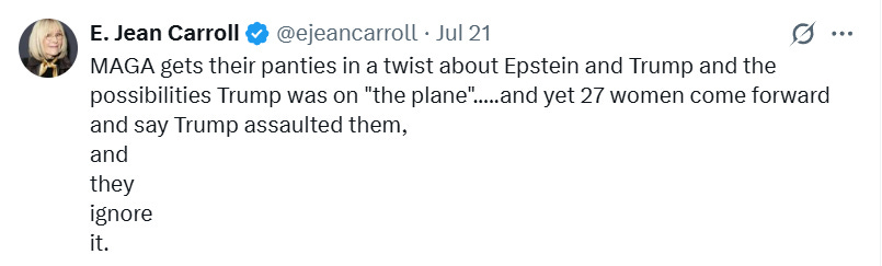 Then she doubled down: "MAGA gets their panties in a twist about Epstein and Trump and the possibilities Trump was on 'the plane'.....and yet 27 women come forward and say Trump assaulted them, and they ignore it."